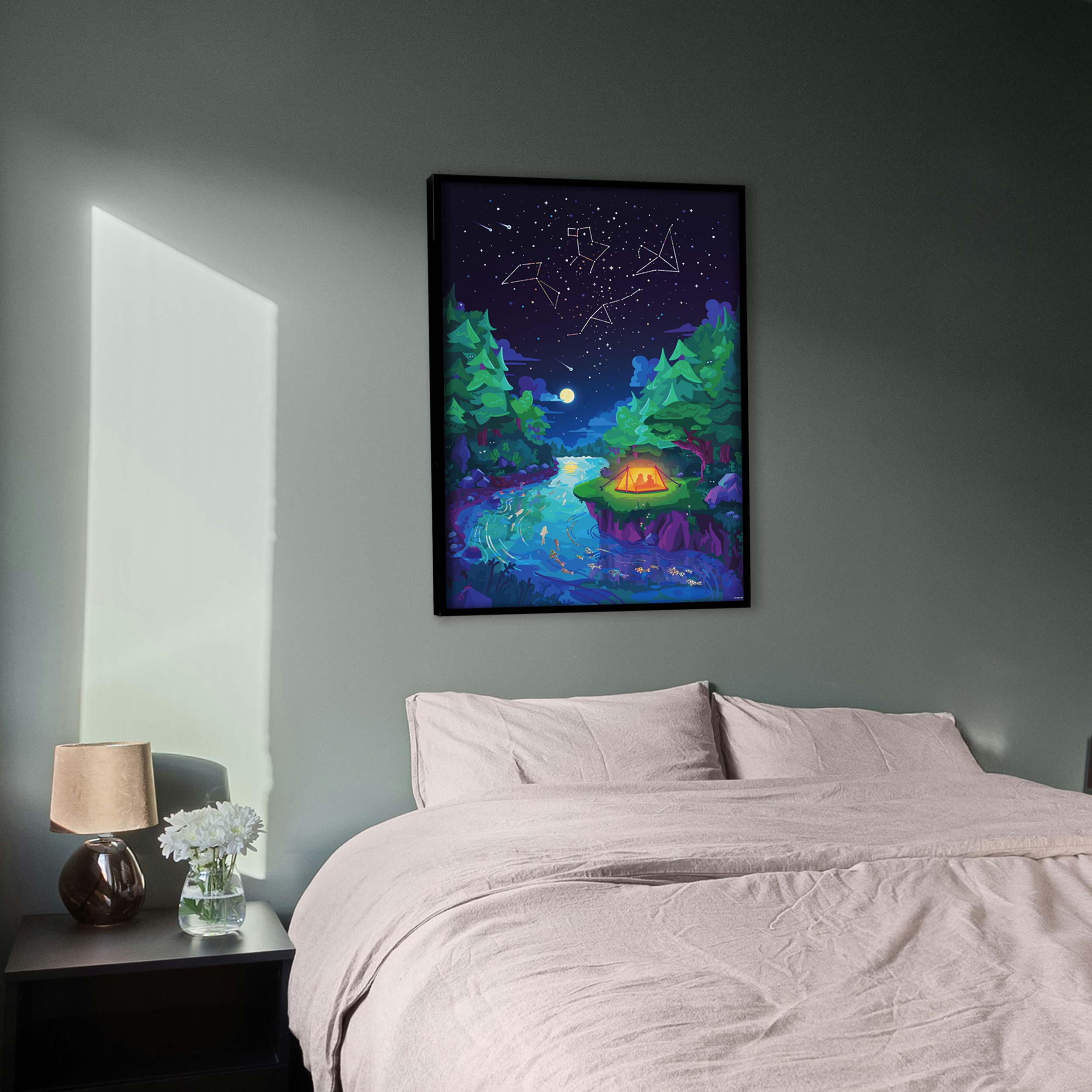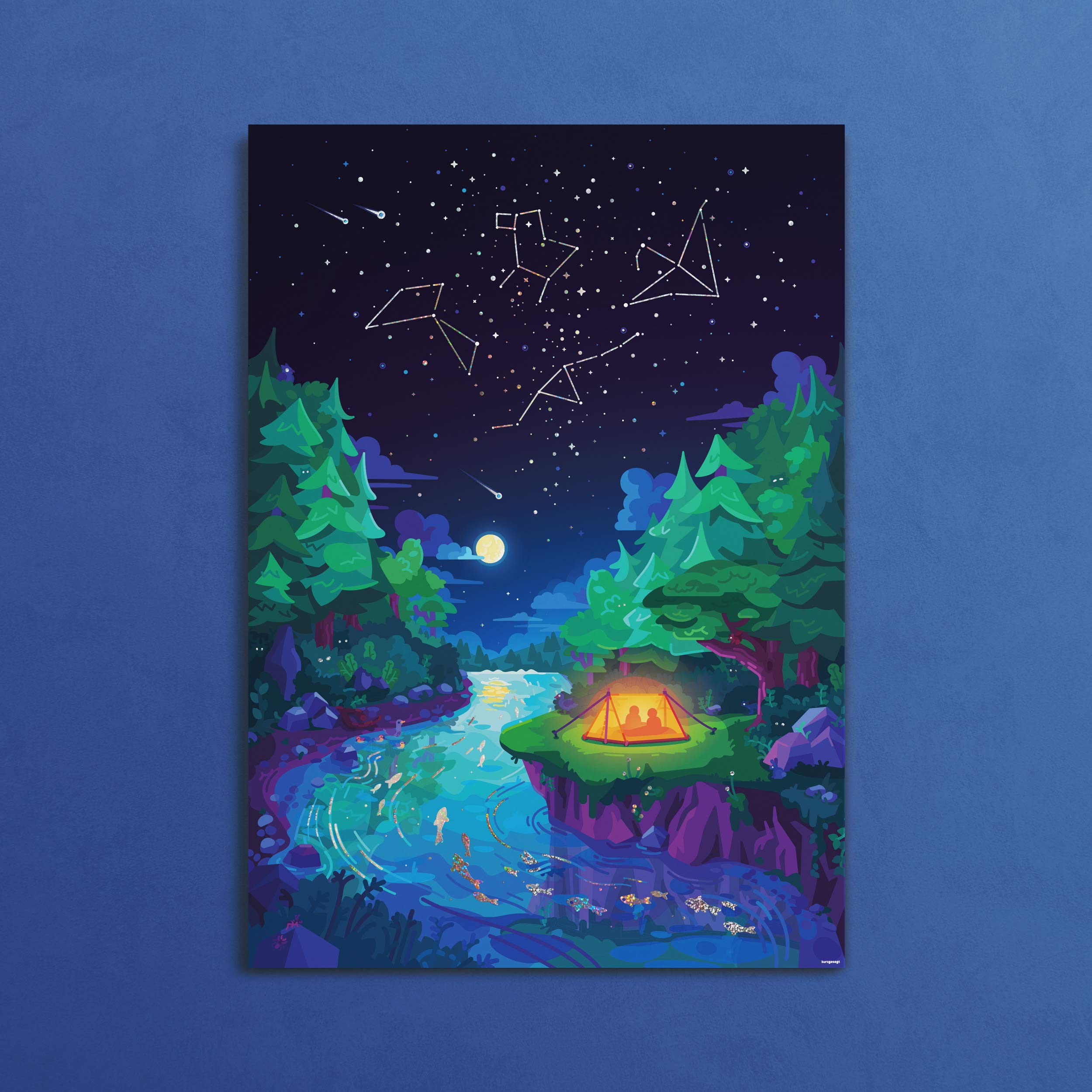 Our Starry Night Poster now features shimmering foil details that bring the constellations to life! Set beneath a vast, twinkling sky, a cozy tent rests by a peaceful river, inviting you to dream of adventures under the stars.