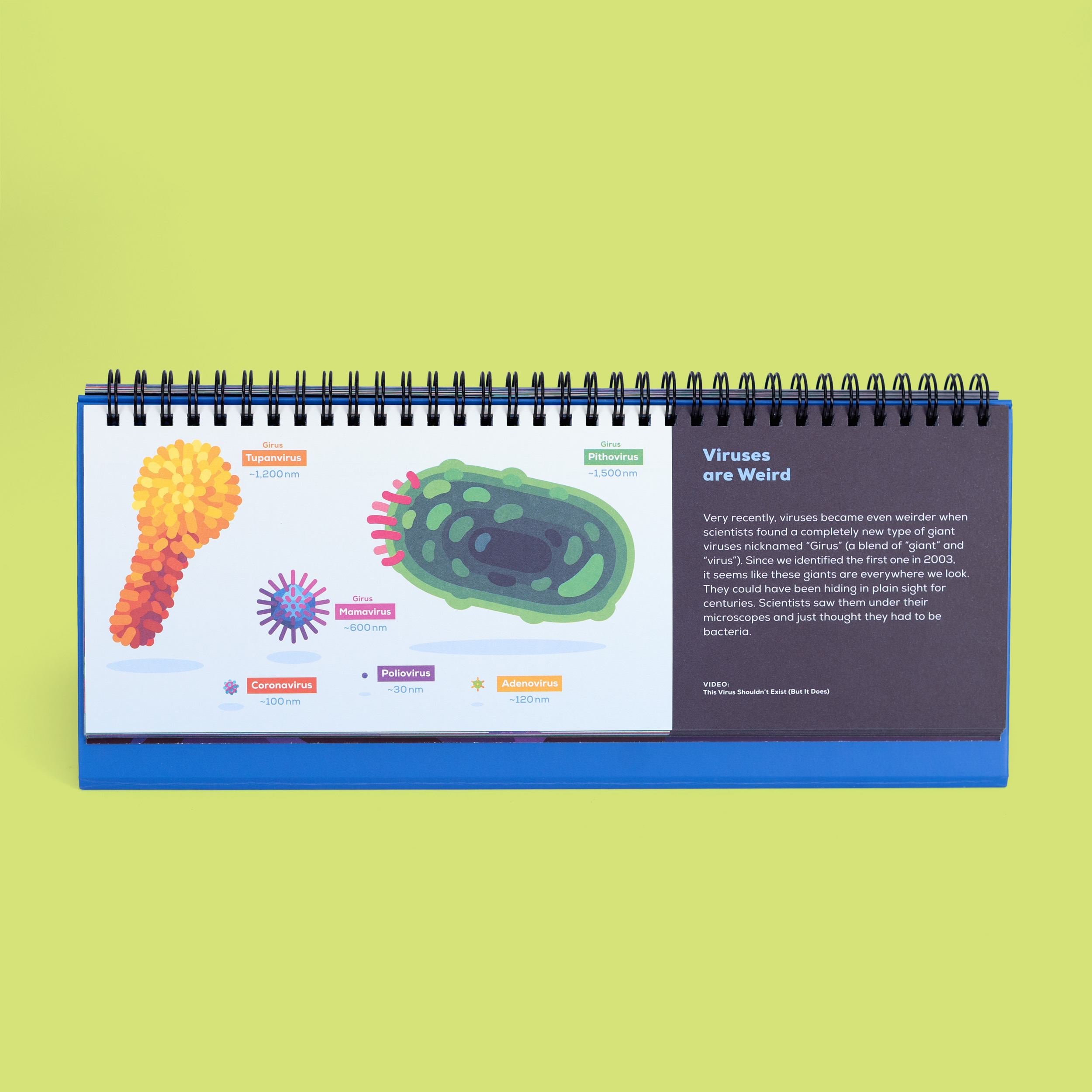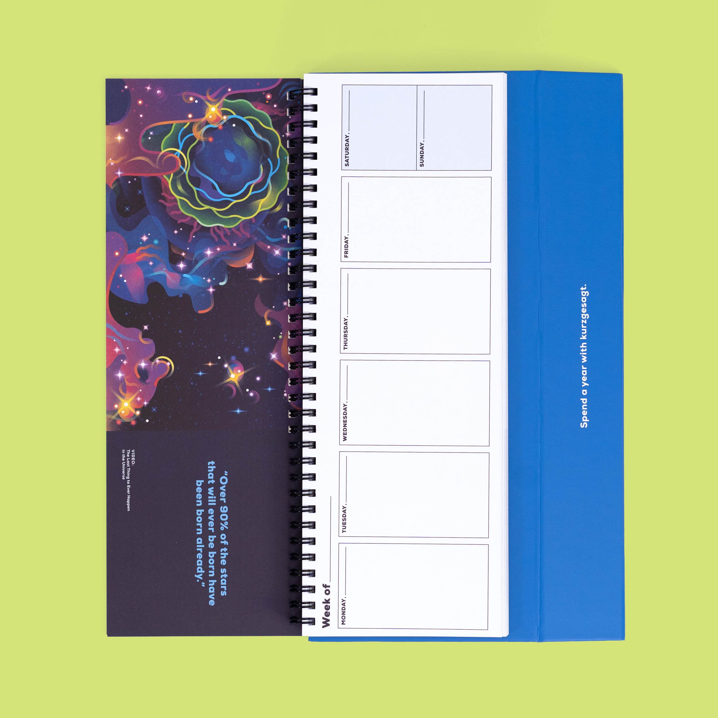• One side of every page features a weekly schedule with space for notes and to-dos, the other side features a kurzgesagt infographic, quote, or fact