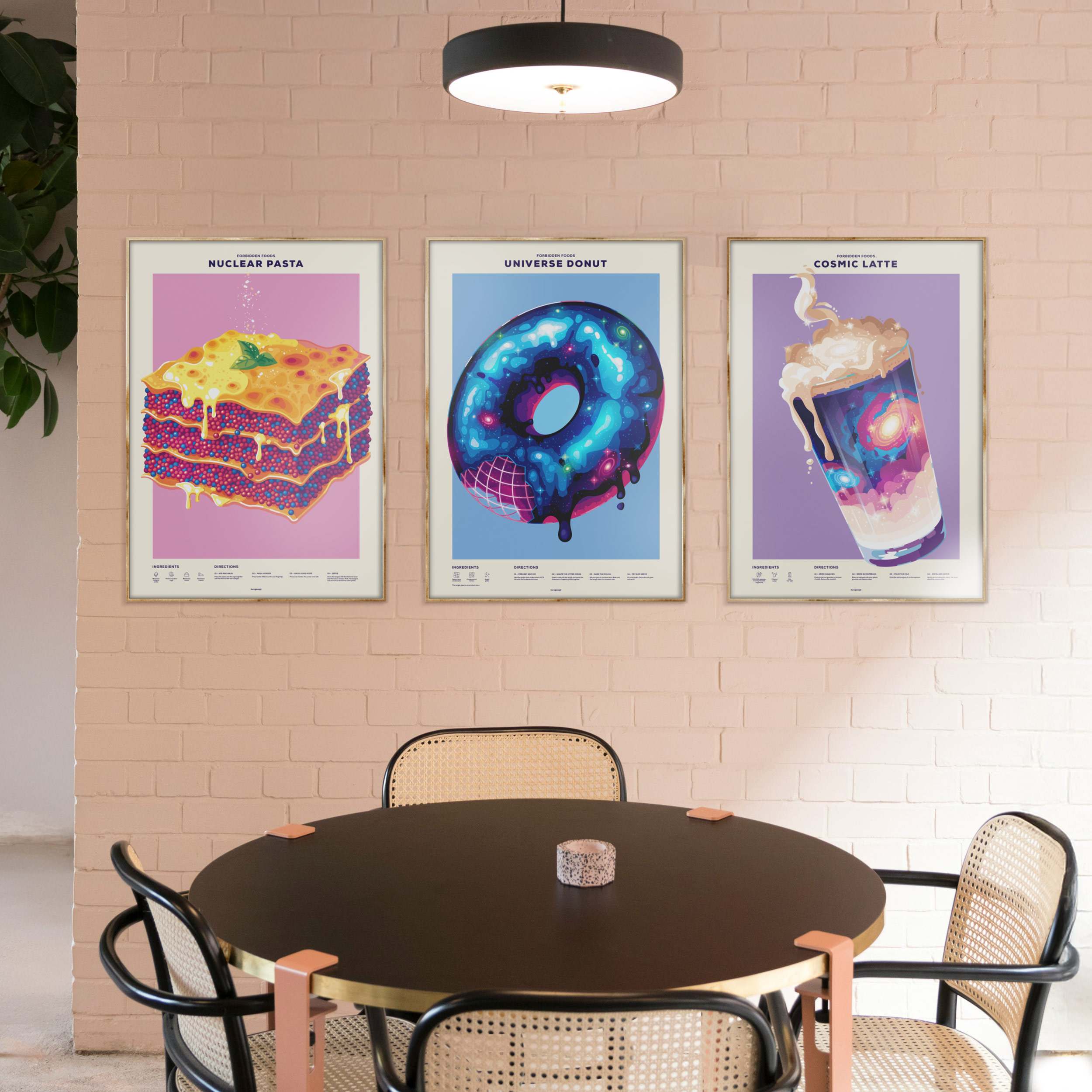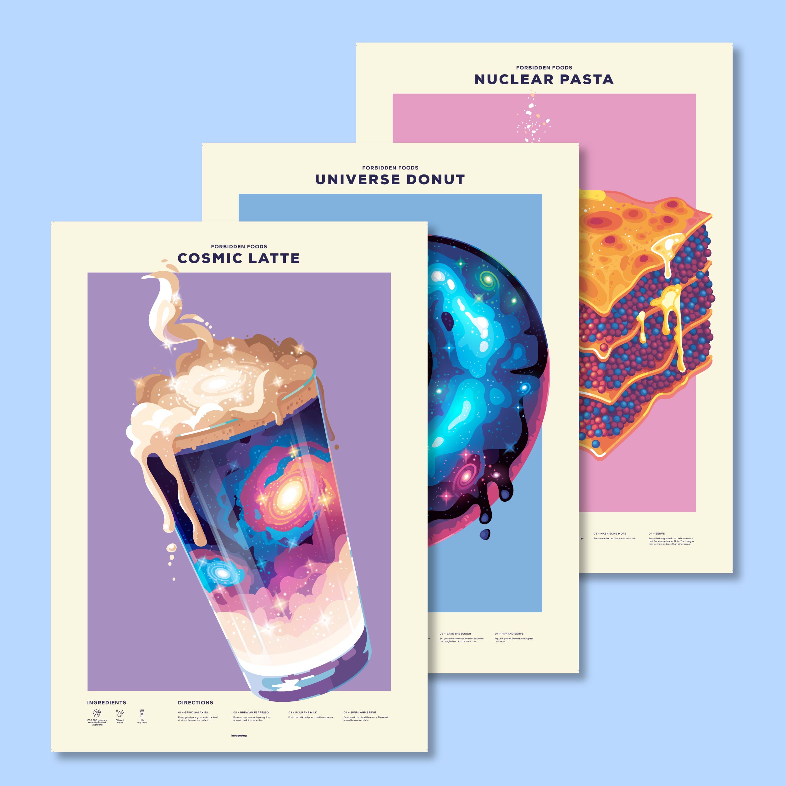 Where science meets cuisine – this stunning poster collection transforms physics and cosmic phenomena into impossibly delicious recipes. Display them together to turn your kitchen into a science-inspired feast for the eyes.