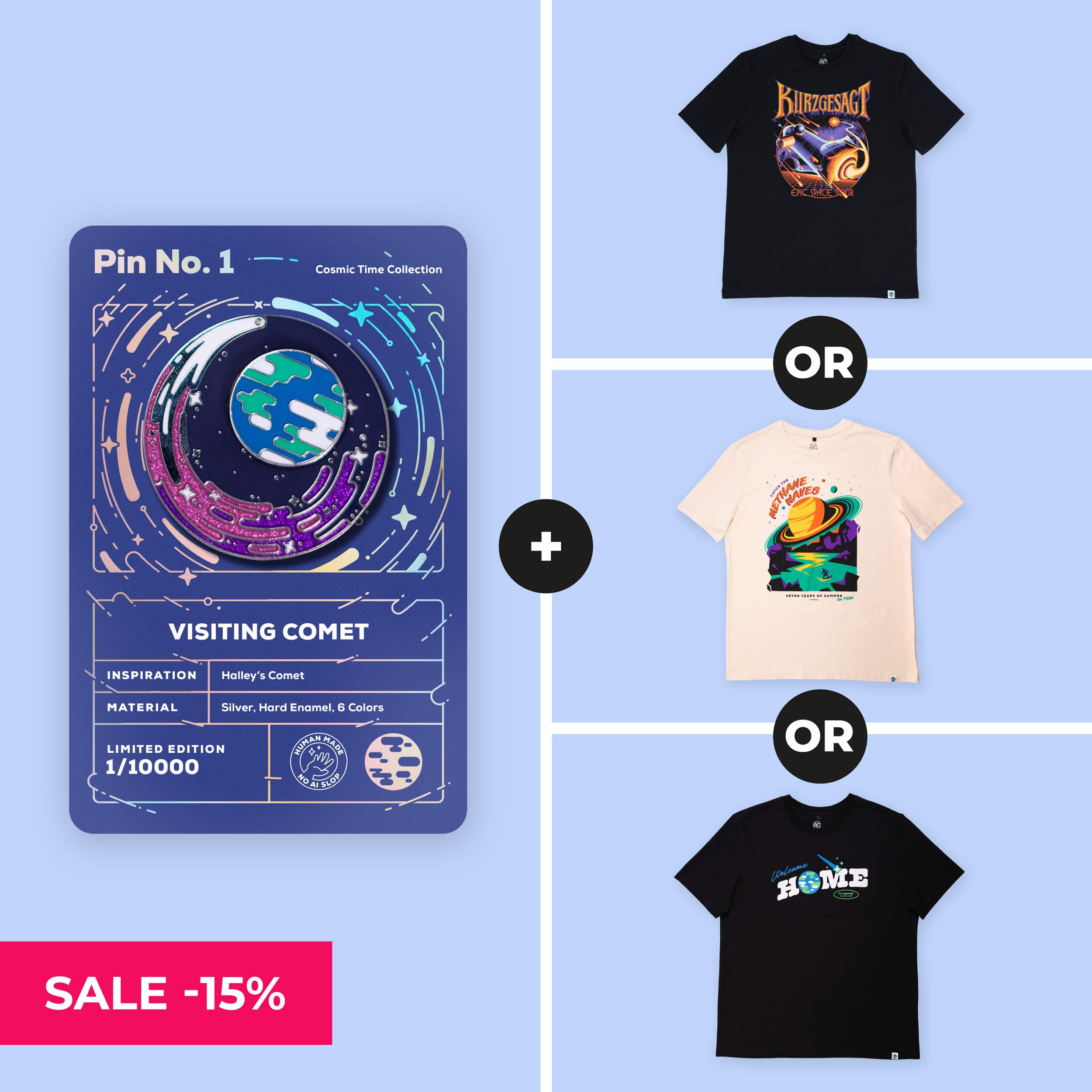 After months of designing, sampling, and testing, we've created a mesmerizing pin that's as satisfying to fidget with as it is beautiful to wear. The Earth and backing plate stays firmly put, while the comet spins freely.