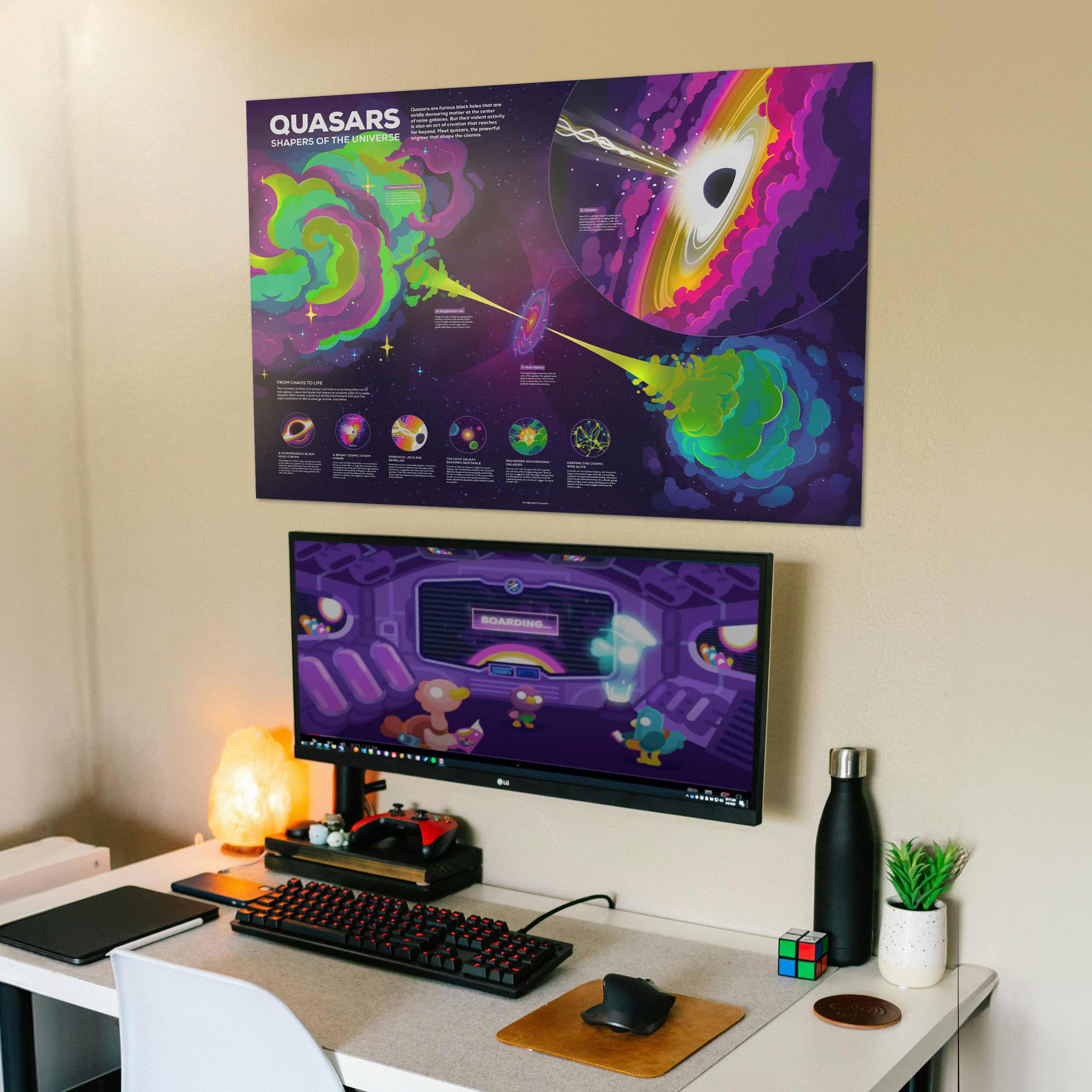 Quasars are the brightest objects in the universe and this poster will be the brightest object in your home, too! Thick, high-quality paper and shiny foil create one spectacular yet educational scene.