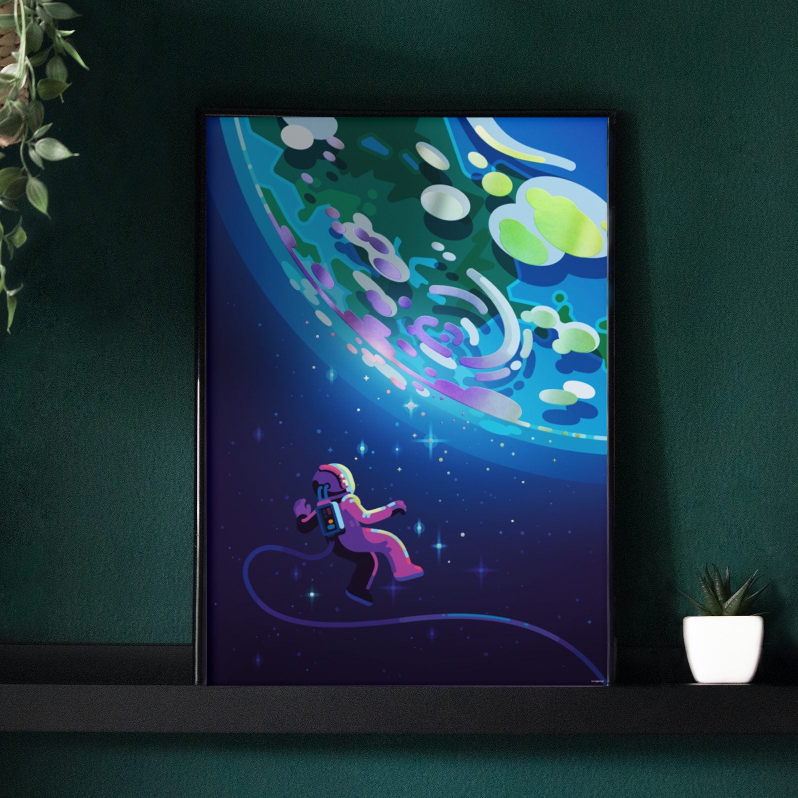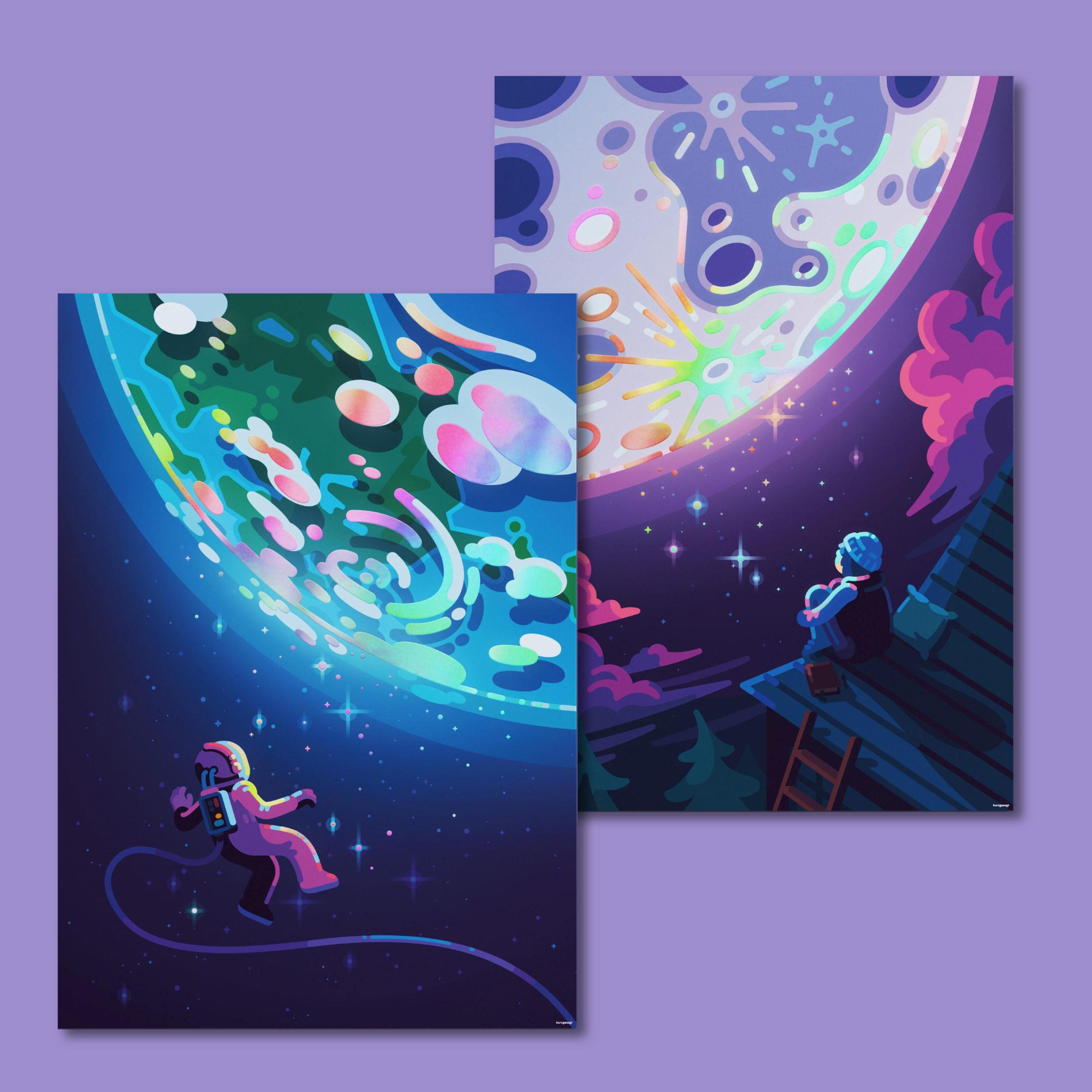 These holographic, shiny posters connect people and places. Place them side-by-side or gift one to a friend. Each sized 18.0" x 24.0" with heavy, high-quality paper and foil finish. Frames not included.