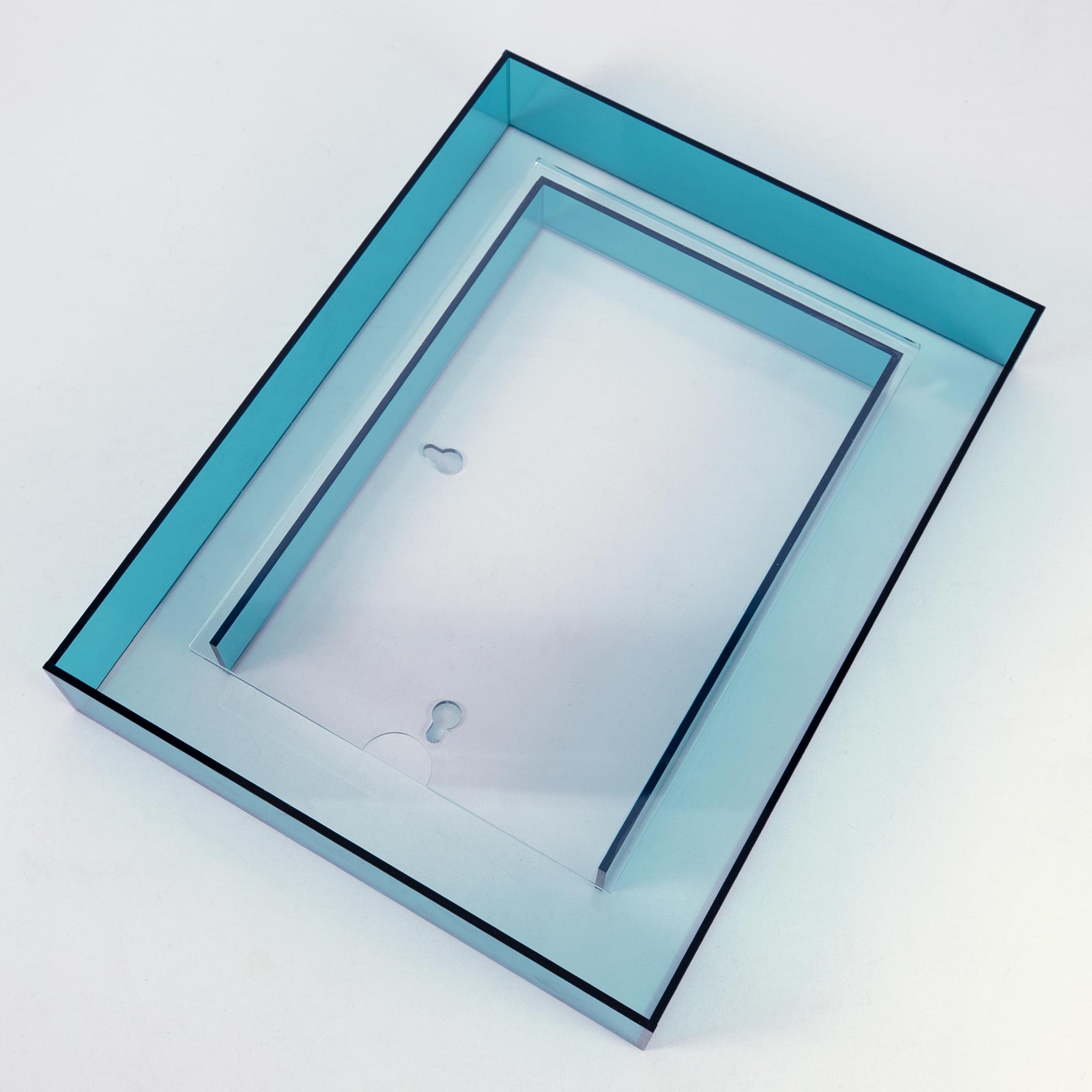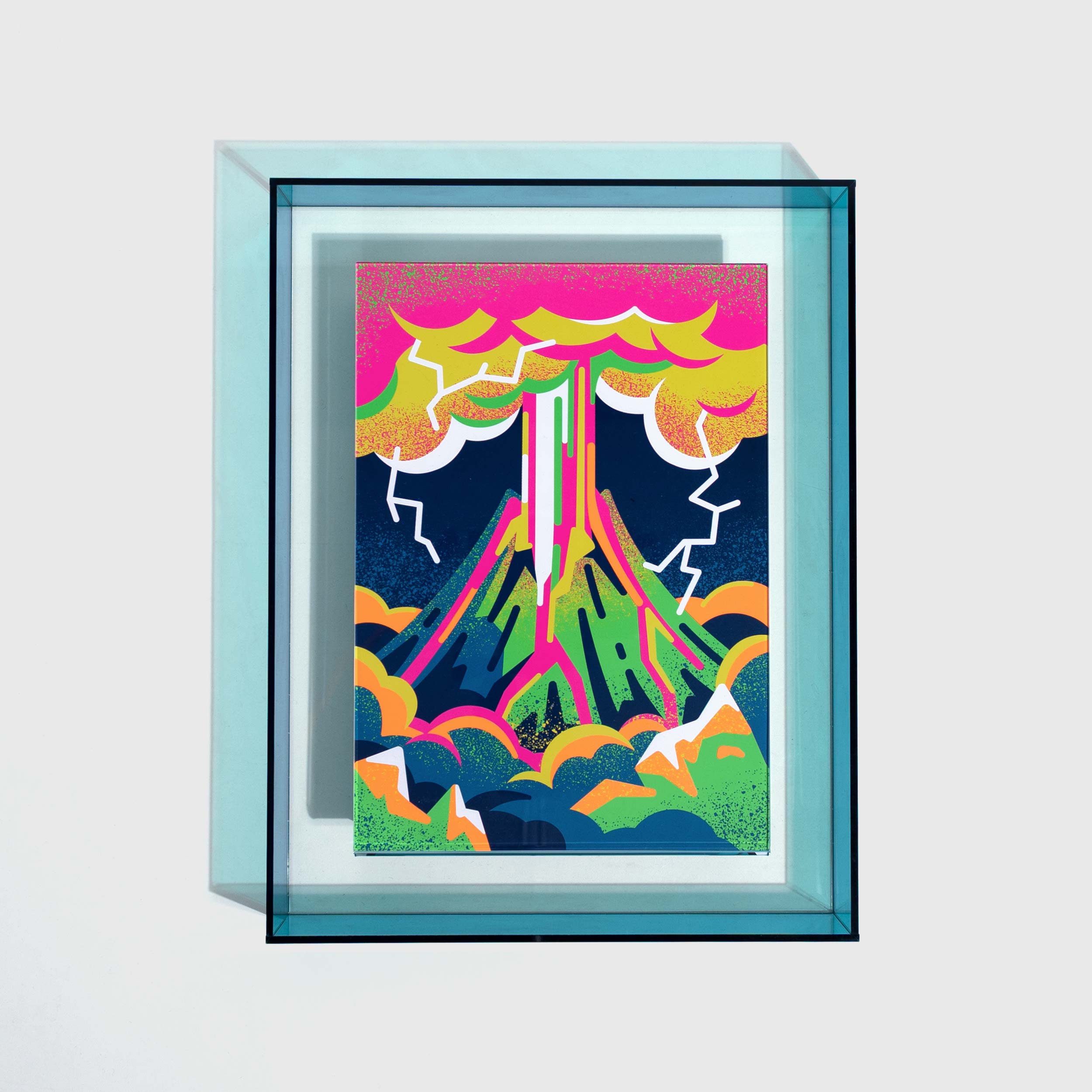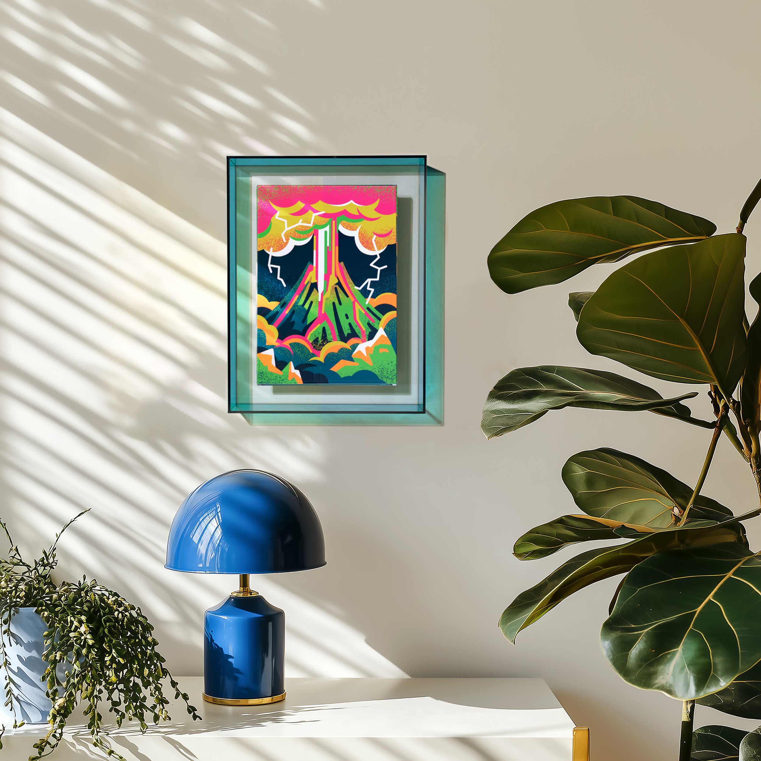 This bold, neon print erupts with vibrant colors, and is paired with a cyan acrylic frame for a captivating scene.