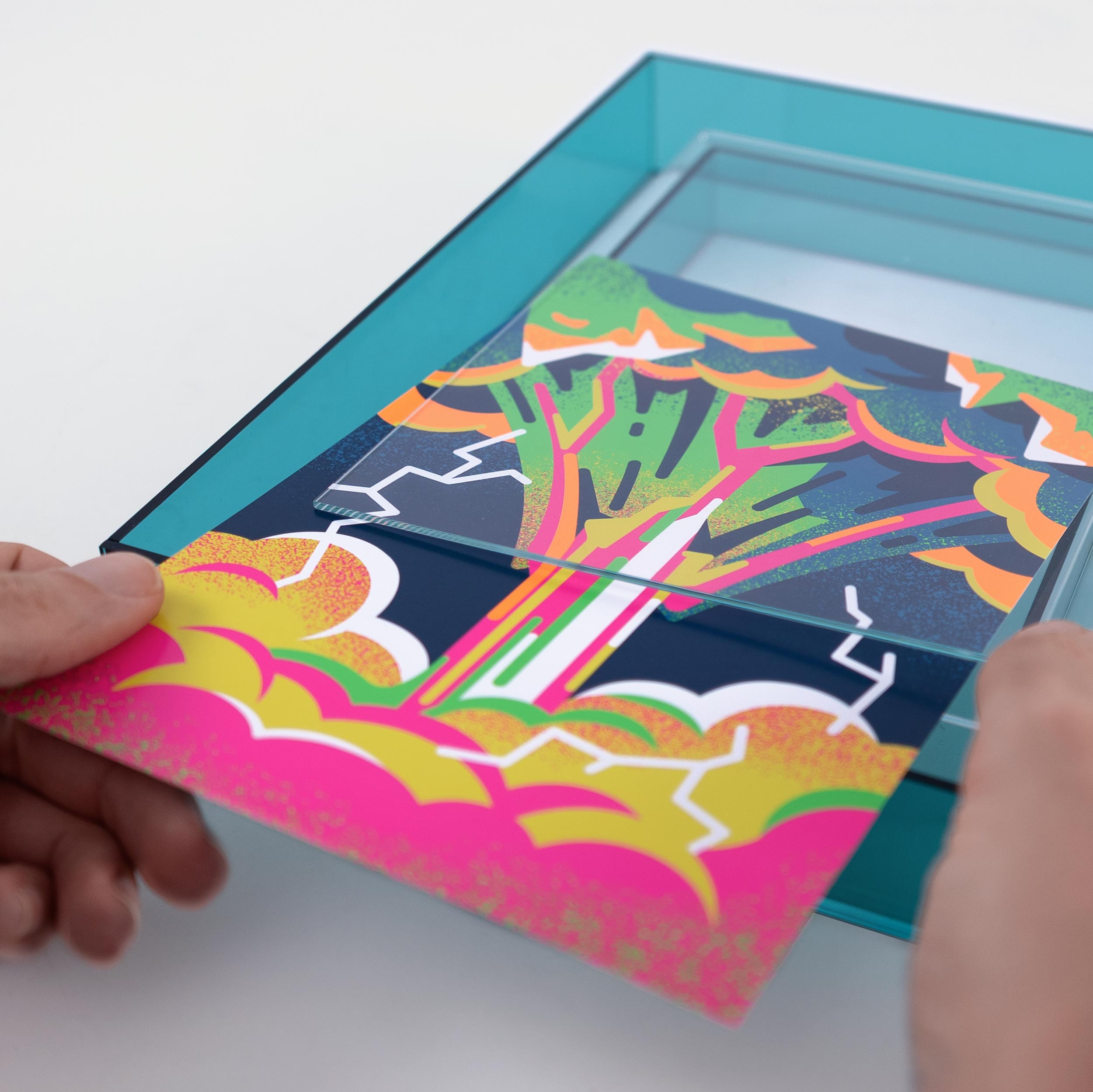 Each high-quality print is illustrated with a striking design and bold, neon colours. They're housed in a neon acrylic frame that shines beautifully in natural light. The sturdy structure is designed to stand solo or hang with ease.