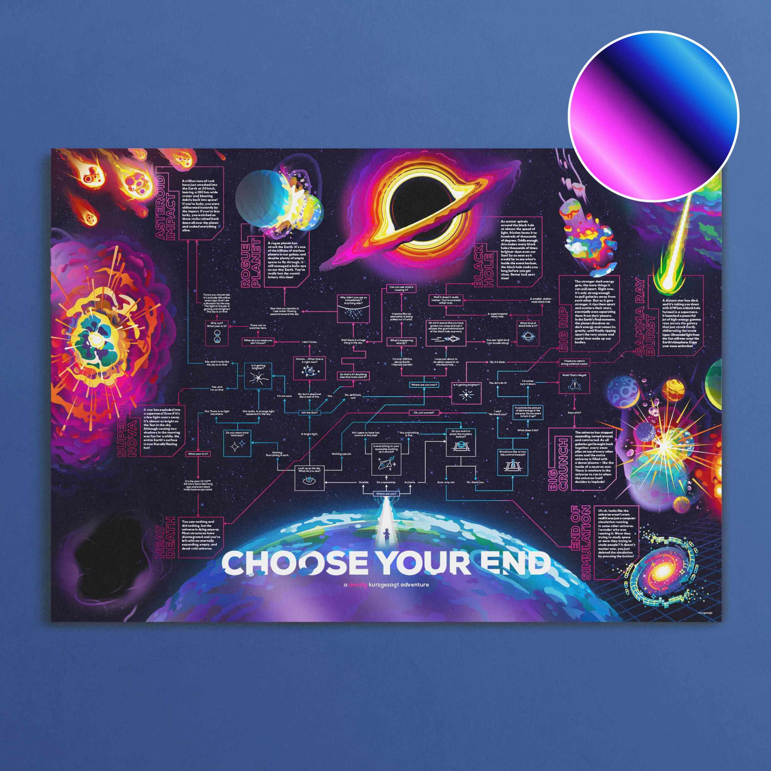 If the world has to end, why not make it sparkle? Printed with metallic foil on thick, high-quality paper, each catastrophic end is extra shiny. This poster is a never end-ing visual adventure for your walls!