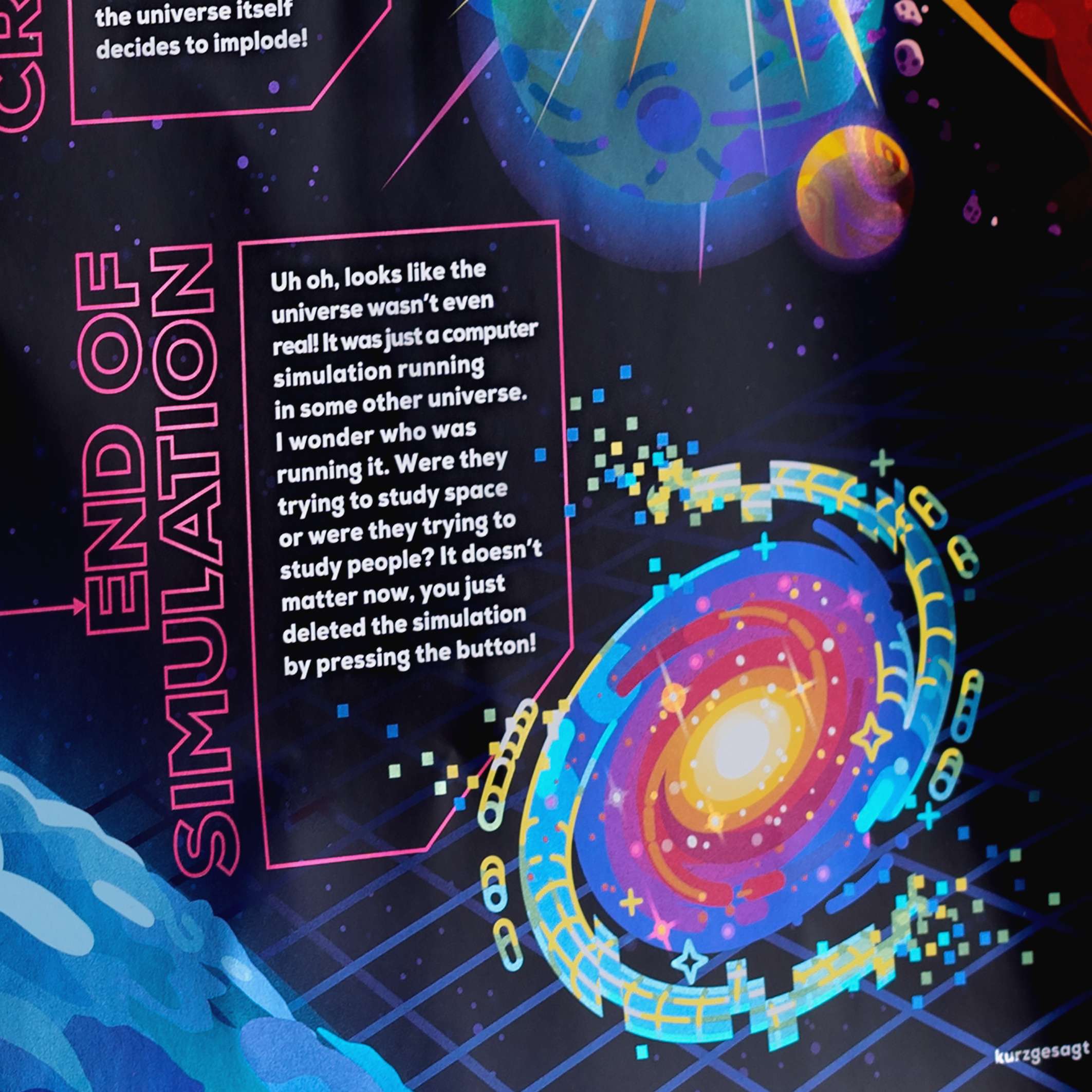 If the world has to end, why not make it sparkle? Printed with metallic foil on thick, high-quality paper, each catastrophic end is extra shiny. This poster is a never end-ing visual adventure for your walls!