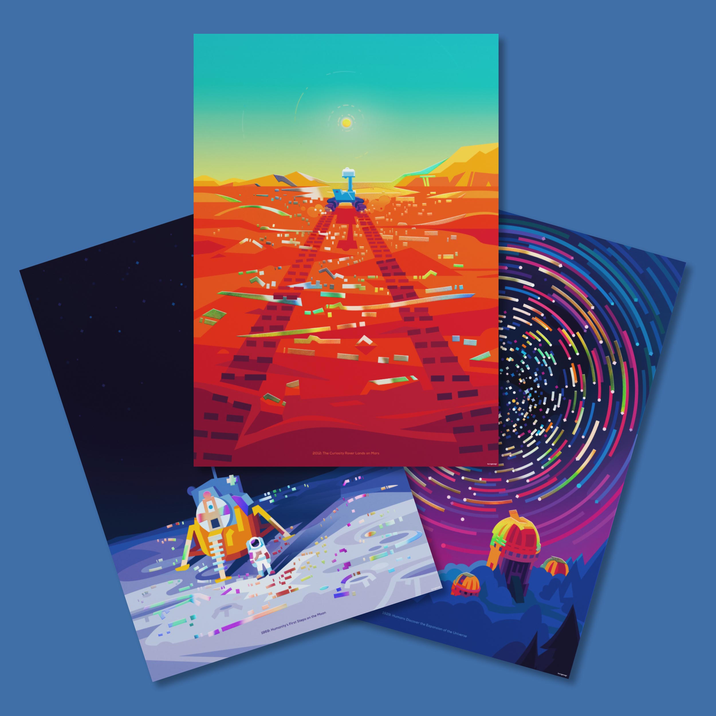 A tribute to humanity’s greatest space achievements – captured in stunning, high-quality foil prints. Depicting missions on Mars, the Moon, and our home Earth, these posters celebrate our relentless curiosity and ambition.