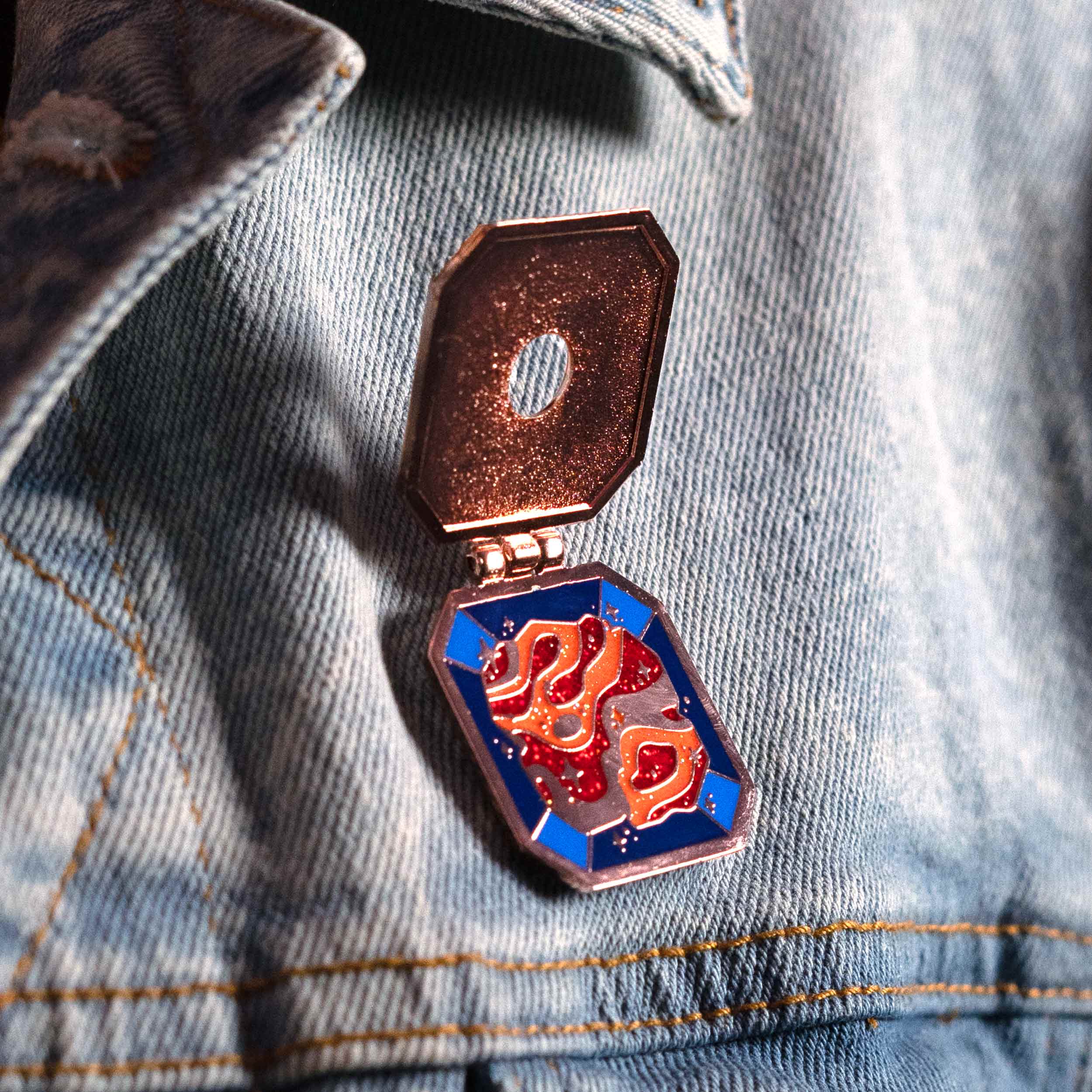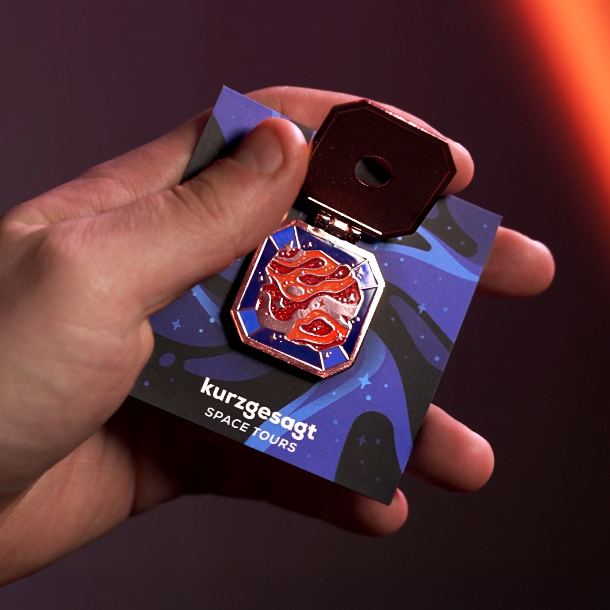 "I love the change in scale when opening the pin. When it’s closed, it looks like a small depiction of planet Mars. Then you open it and discover a sample of glittering Mars dust within – all while looking at the same piece. As for the inside, we wanted to make it feel like a personal jewelry box or small treasure chest." Steffi, Product Team Illustrator |